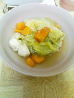キャベツとニンジンと玉ねぎと肉(むね肉)←安い を切ってあたしの愛用中の圧力鍋に入れて塩コショウを適当に振って、酒を適当に入れて適当に水入れて火にかけるだけ!!